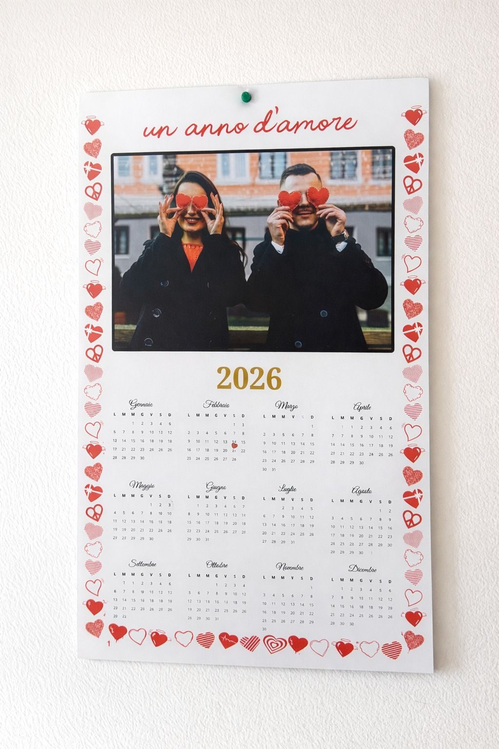 Un calendario da appendere al muro pensato per accompagnarti ogni giorno con un ricordo speciale. Perfetto per celebrare un anniversario, una storia d’amore o un momento importante, unisce funzionalità e valore emotivo.