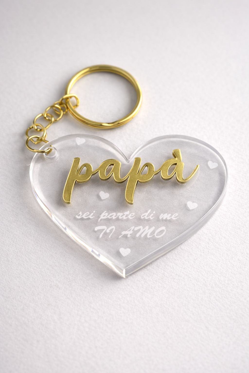 La scritta “papà” in rilievo effetto oro dona tridimensionalità e un tocco elegante, mentre la frase incisa “sei parte di me – ti amo” completa il messaggio con dolcezza e profondità. I piccoli cuori bianchi stampati arricchiscono il design, rendendolo perfetto per un regalo speciale.