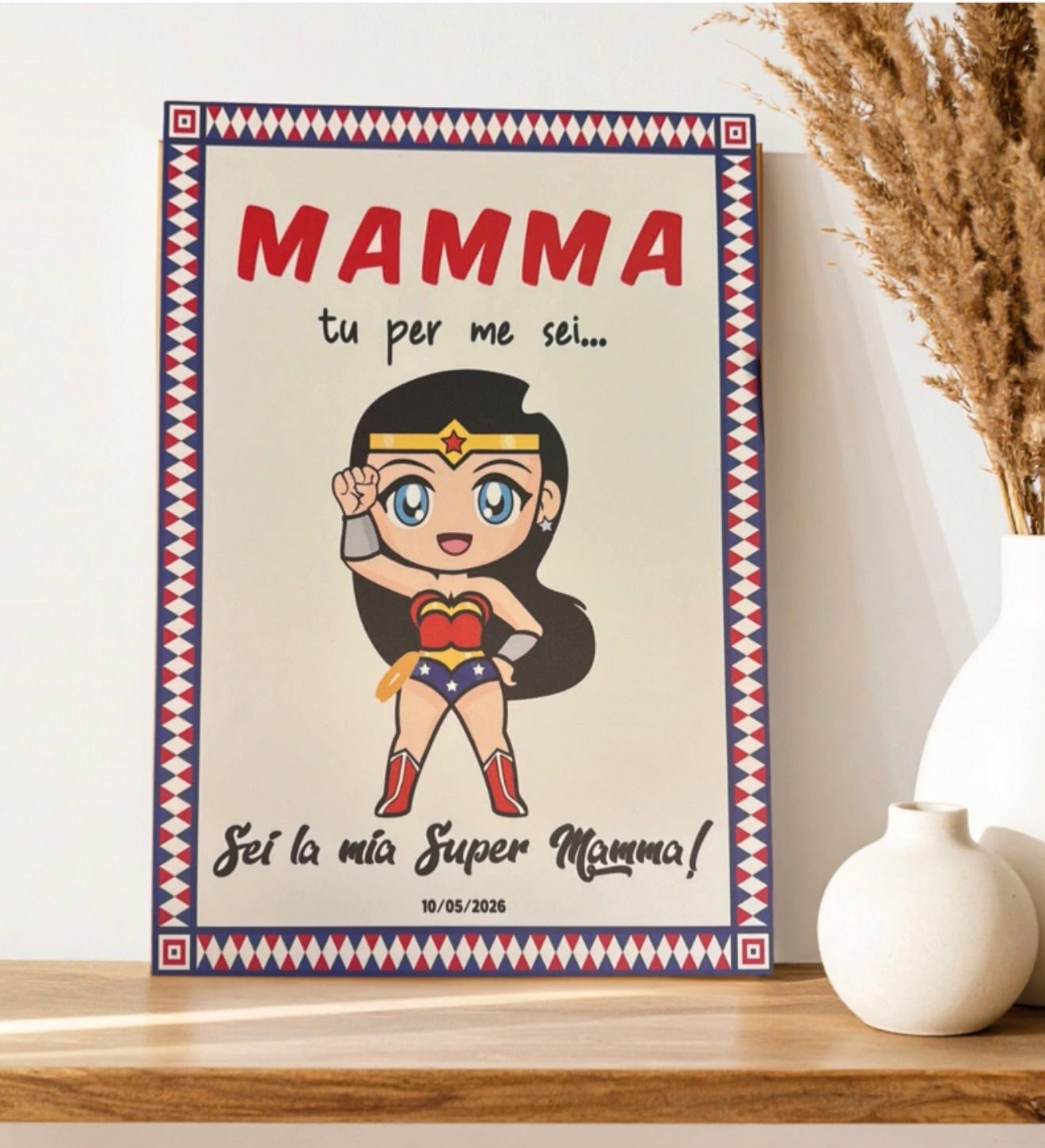 Il quadro in Forex formato A3 “Super Mamma” celebra la forza, l’amore e il coraggio di ogni mamma con una grafica in stile supereroina, dolce ma potente allo stesso tempo.